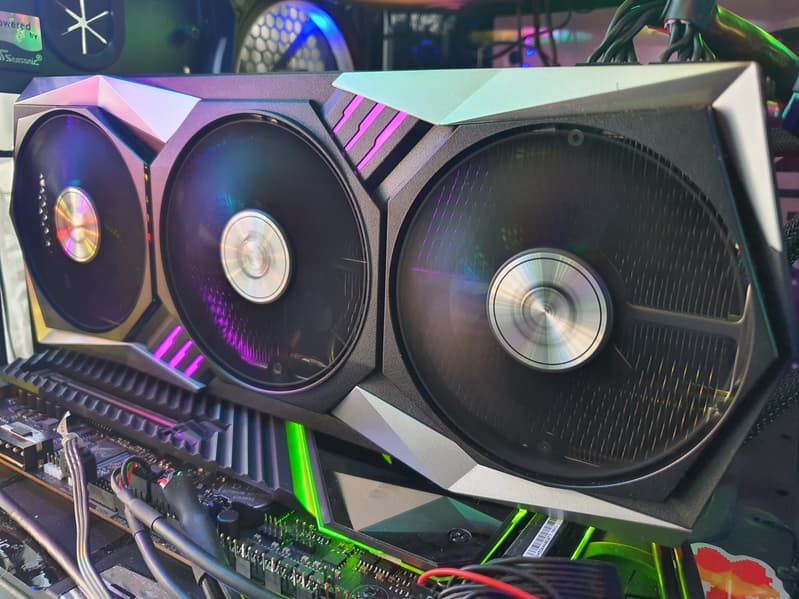 MSI Radeon RX 6800 XT Gaming X Trio 16G (16 ГБ) — прекрасный конкурент флагманским видеокартам на Nvidia GeForce RTX 3080 для игр без трассировки лучей: в целом они почти на одном уровне. Если вынести за скобки GeForce RTX 3090, как изначально полуигровой-полупрофессиональный продукт, то Radeon RX 6800 XT и GeForce RTX 3080 — самые передовые игровые ускорители. Карта MSI имеет приличные размеры из-за кулера, она занимает 3 слота в системном блоке, но зато СО тихая.