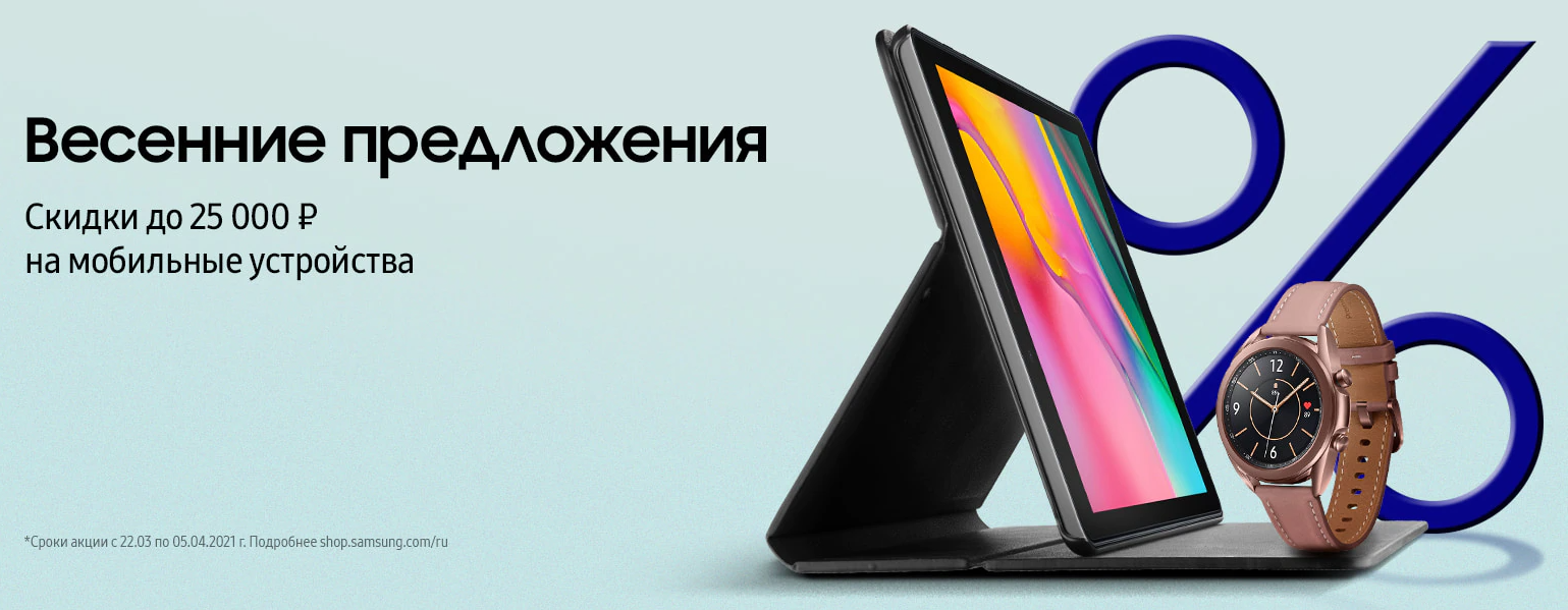 В рамках акции «Весенние предложения» обещаны скидки до 25 тысяч рублей на мобильные устройства. Акция действует до 5 апреля 2021 года включительно.