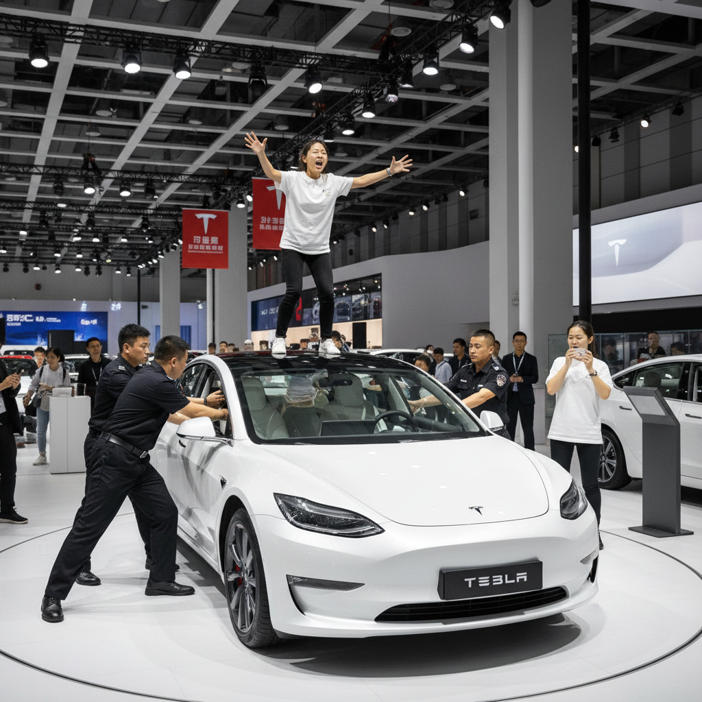 Одна женщина стояла на крыше выставочного автомобиля Tesla и кричала о том, что тормозная система её автомобиля оказалась ненадёжной и что Tesla подвела её. Вскоре после этого женщину сняли с автомобиля охранники. Обе женщины были одеты в белые футболки с надписью «Неисправность тормозной системы Tesla» и логотипом Tesla.