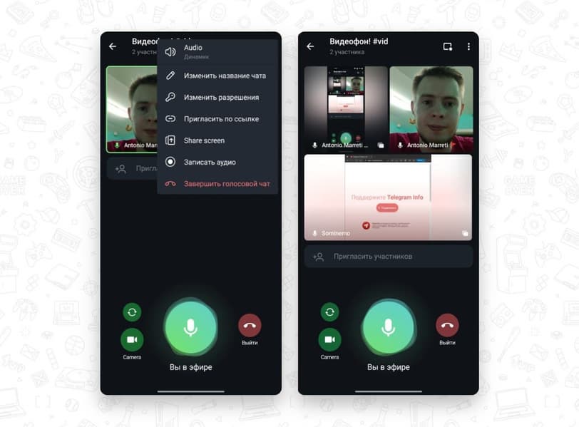 Об этом сообщил тематический канал Telegram Info. Отмечается, что каждый участник голосового чата теперь может одновременно запустить видео с веб-камеры и транслировать свой экран.
