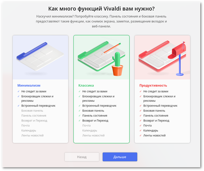 Теперь при первом запуске браузера будет выводиться окно приветствия с тремя наборами функций, доступных по умолчанию непосредственно из интерфейса приложения — минимальный набор функций, классический или максимальный. Каждую из скрытых функций можно будет впоследствии активировать вручную.
