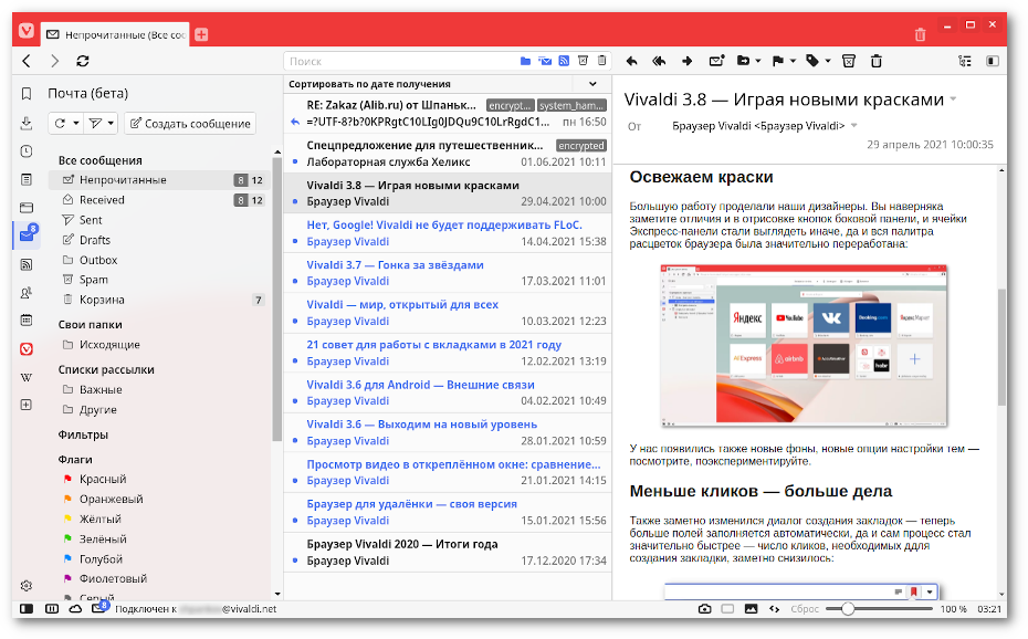 Также в десктопном Vivaldi появился клиент электронной почты с довольно широкой функциональностью и поддержкой разных почтовых сервисов.