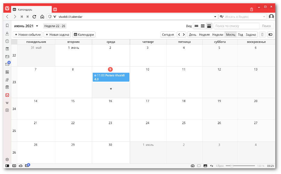 Ещё один компонент Vivaldi 4.0 — календарь, который можно использовать локально или подключить к популярным онлайн-сервисам. Пользователь может приглашать на мероприятия других участников, а также принимать чужие приглашения, управлять задачами и так далее.