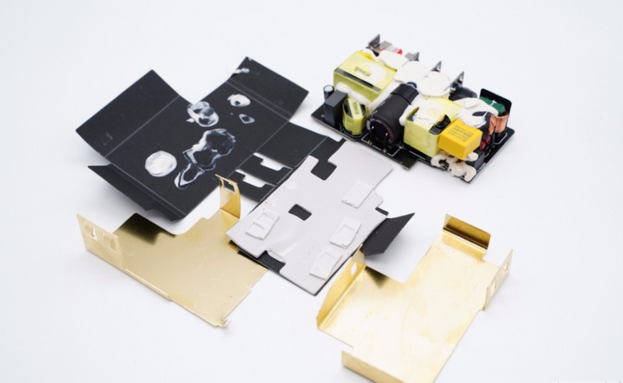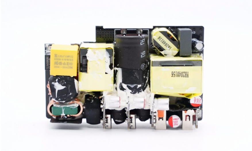 Вид платы спереди. Слева есть схема коррекции коэффициента мощности PFC, правая сторона — импульсный источник питания, а четыре USB-разъема припаяны небольшими платами. После осмотра зарядного устройства было обнаружено, что в нем используется технология APFC для усиления импульсного источника питания LLC. Импульсный источник питания имеет выход постоянного напряжения, синхронное выпрямление и трехканальный синхронный понижающий четырехпортовый выпрямитель.