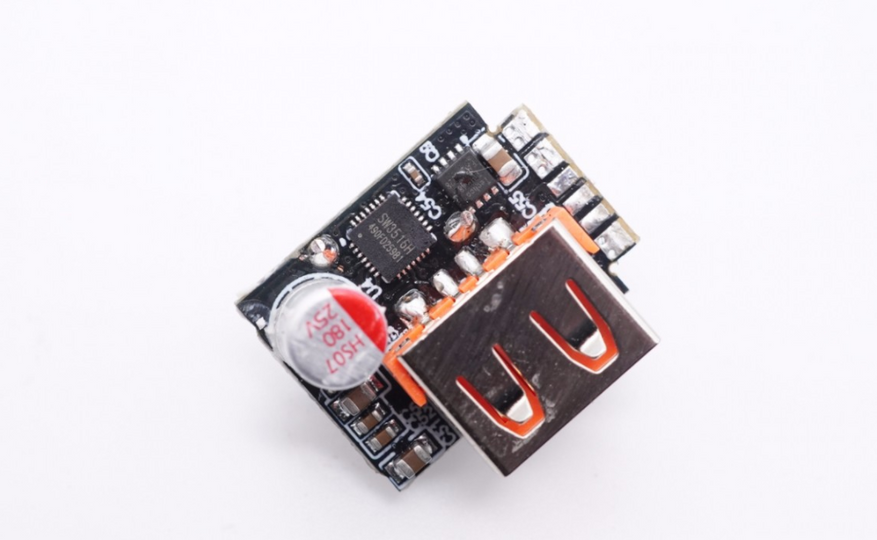 Плата с портом USB. Есть интегральная схема и твердотелый конденсатор.