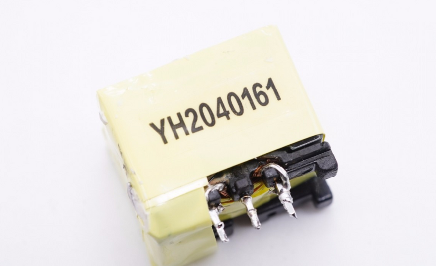 Крупным планом трансформатор LLC экранмрованный медной фольгой, прикрепленной к магнитному сердечнику.
