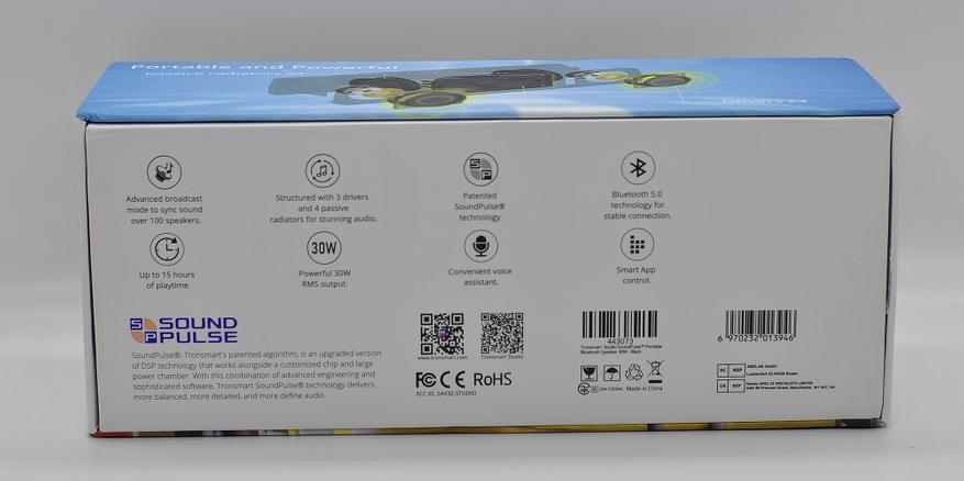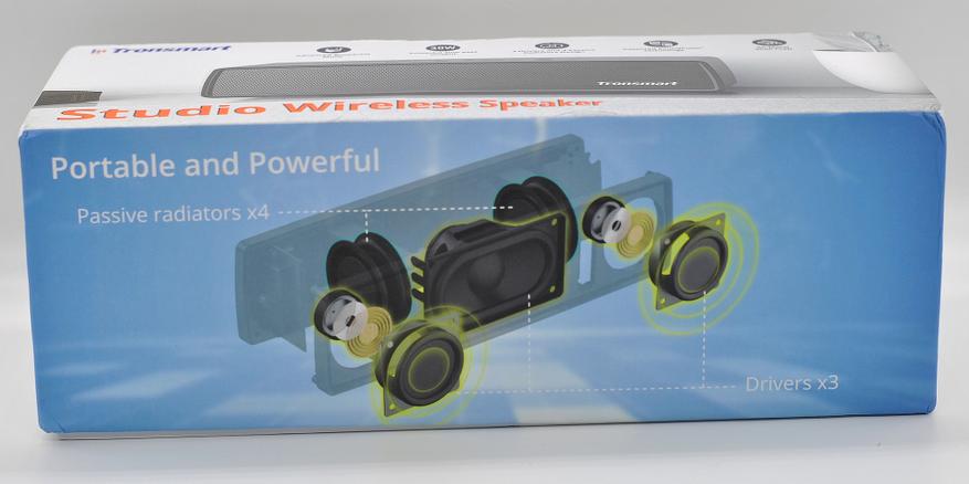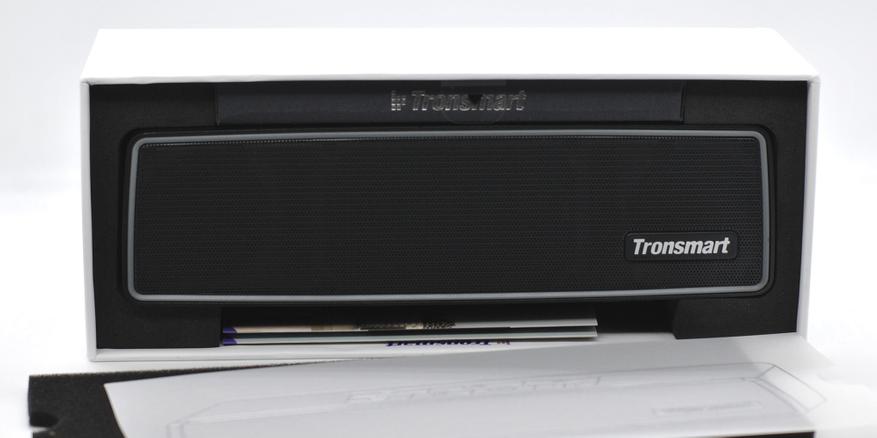 Упаковка колонки типичная для Tronsmart, плотный картон и цветная полиграфия. Все характеристики и технологии подробно расписаны. Внутри защитная вставка.