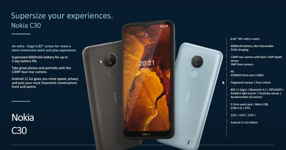 Вместе с защищённым смартфоном Nokia XR20 компания HMD Global сегодня представила бюджетный смартфон Nokia C30. Формально он стал флагманом серии, на что указывает также самый большой в линейке экран и аккумулятор наибольшей ёмкости.