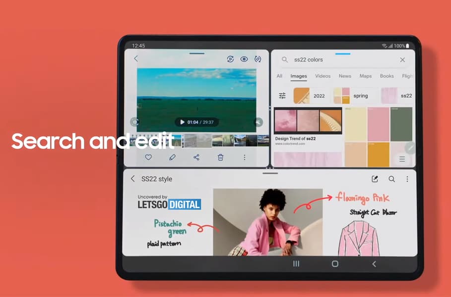 На отметке 46:17 демонстрируется совместимость смартфона Galaxy Z Fold 3 со стилусом S Pen. В ролике показано, как в строке поиска вводится запрос SS22 colors. После чего открывается окно, показывающее диапазон различных весенних цветов, от бледно-желтого и оранжевого до розового и зеленого. Также указываются два названия: «Pistachio Green» и «Flamingo Pink» с надписями «Design Trend of SS22», «2022» и «spring» над ними.
