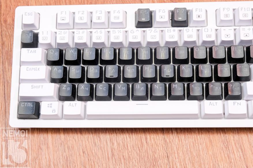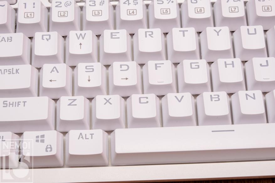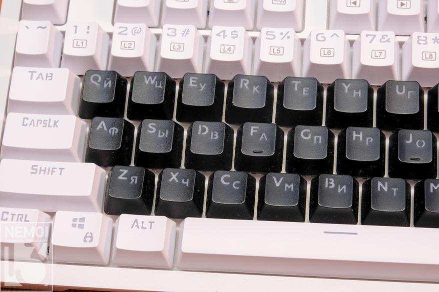 Кейкапы сделаны очень качественно. На них используется свой, приятный по дизайну шрифт. Единственный минус, это отсутствие русского языка. Но тут многие решают эту проблему по-разному. Кто-то клеит наклейки, кто-то, просто владея слепой печатью не смотрит на клавиши, а кто-то меняет кейкапы на свои (как это сделал я) А есть еще любители полностью пустых клавиш, на которых совсем нет символов. Сами кейкапы изготовлены стандартно, методом литья. Символы в них прозрачные, для подсветки снизу.