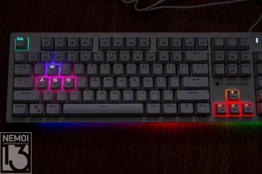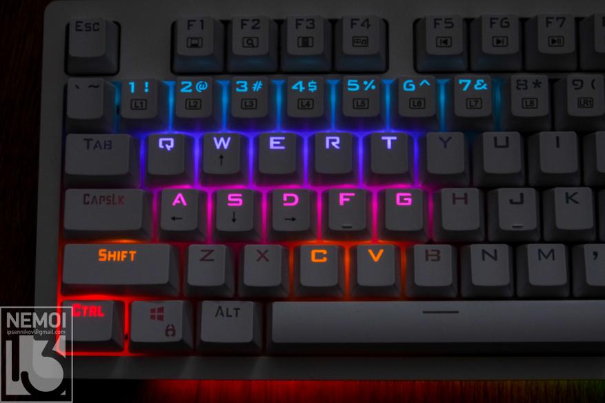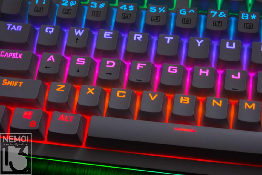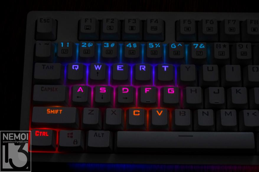 Подсветка у клавиатуры RGB и может быть настроена под себя. Регулируется яркость, режимы, эффекты, и даже есть предустановленные режимы, в которых подсвечиваются только используемые в игре клавиши. Как это выглядит, можно посмотреть на видео: