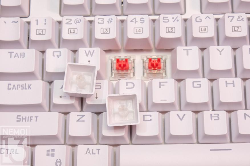 Если снять кейкапы, то можно увидеть, что в клавиатуре используются действительно красные свитчи:
