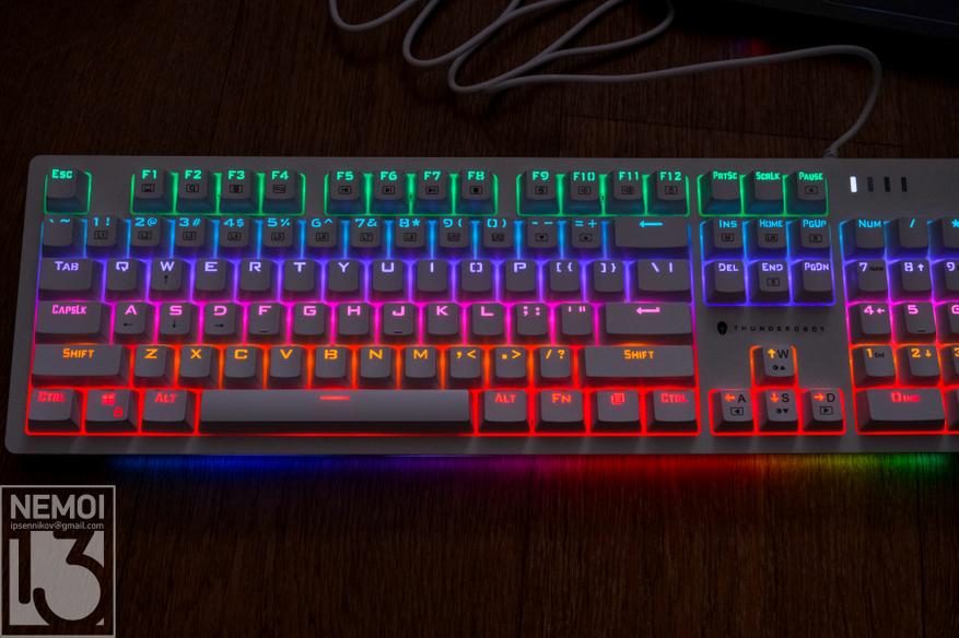 Могу ли я рекомендовать клавиатуру Thunderobot KG3104R к покупке? Если вы хотите попробовать механику, то это неплохой вариант. У клавиатуры очень приятный ход клавиш и нет щелчков, характерных синим свитчам. При этом клавиатура выглядит очень красиво, хотя белый цвет маркий. Единственно хочу напомнить про минусы: клавиатура не тихая, и это может оттолкнуть, ну и отсутствие русской раскладки подойдет не всем. Это тоже надо знать заранее, и решить, как это исправить. Хотя идеальным вариантом будет покупка кейкапов с русской раскладкой. В остальном же, клавиатура отличная. Удобная, приятная, красивая. Такая клавиатура будет не только удобным инструментом, но и украшением рабочего стола.