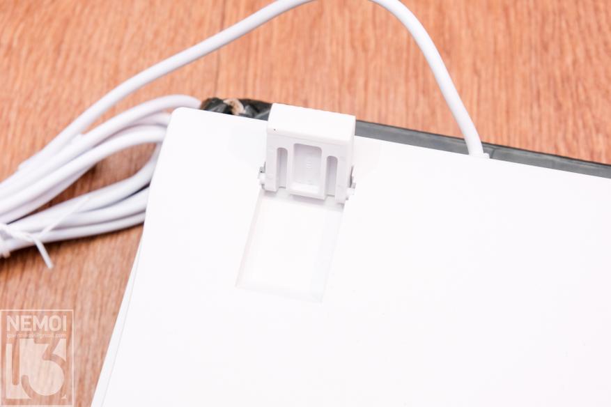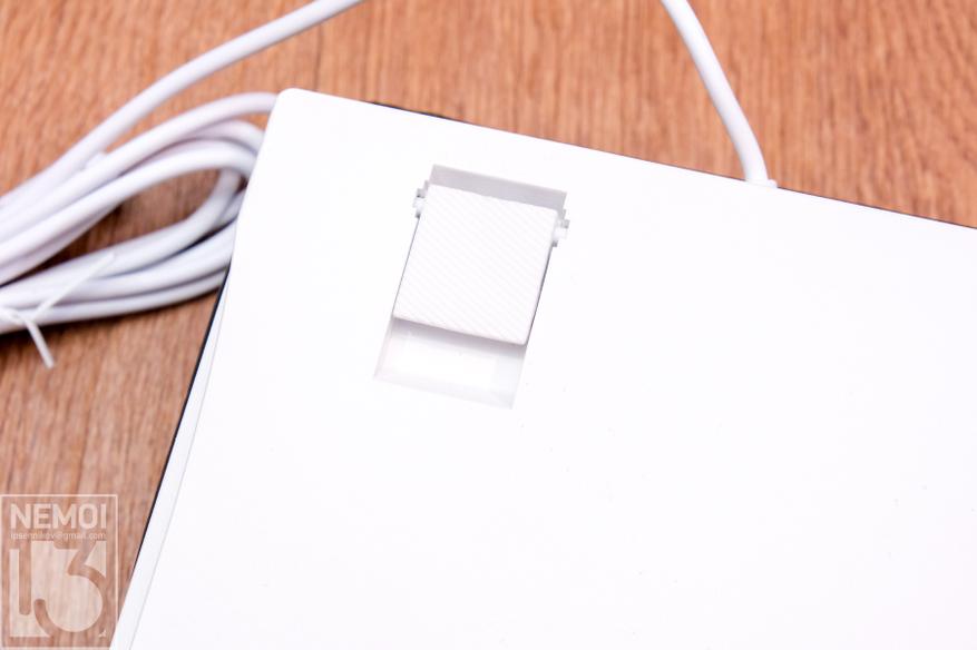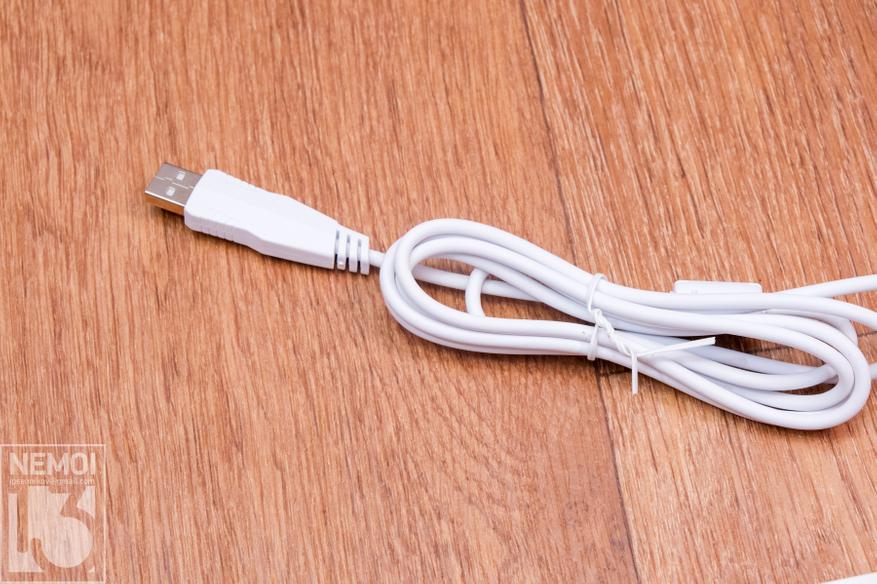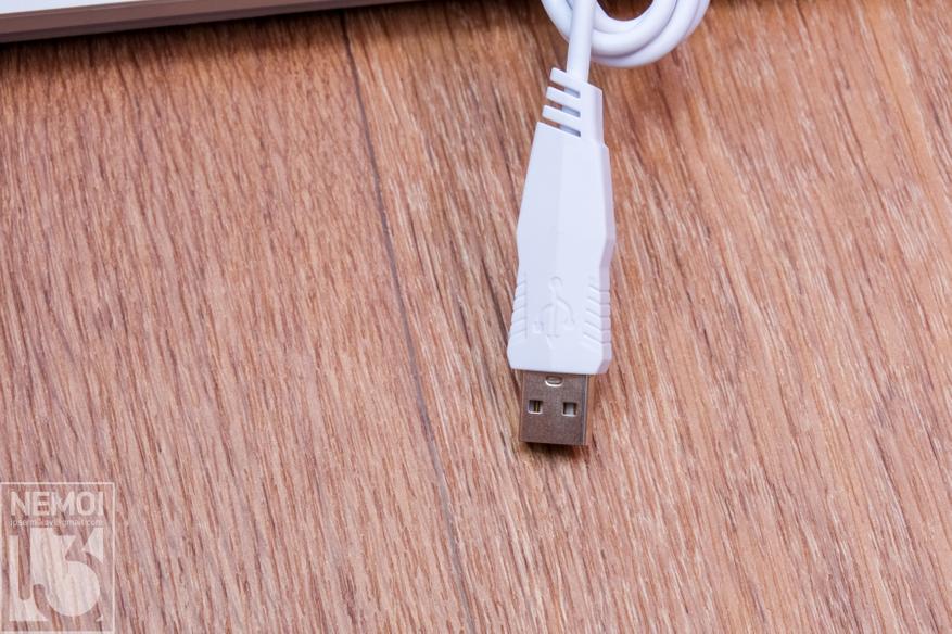 Шнур у клавиатуры имеет длину 1.5 метра. Он тоже белый, как и весь корпус. Оплётка больше похожа на ПВХ, так как силикон более мягкий. А хотелось бы видеть тут именно силикон. Но это придирки. На конце провода находится стандартный USB штекер для подключения к USB порту компьютера: