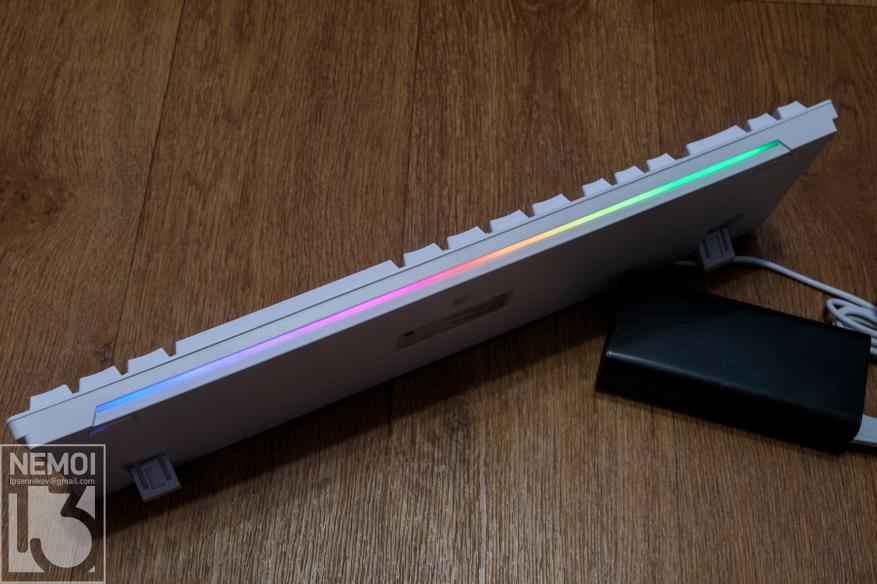 Корпус клавиатуры изготовлен из пластика, он здесь матовый и качественный. Правда не всем понравится белый цвет, так как он достаточно маркий. Но это на любителя. Если посмотреть на клавиатуру с разных сторон, то можно увидеть, что сверху находятся 104 стандартных клавиши. По бокам ничего нет. На задней стороне тоже пусто, только выходит провод (а хотелось бы видеть там, например, пару USB портов, чтобы можно было использовать клавиатуру еще и как USB хаб). А вот на боку, который направлен к пользователю, находится прозрачная вставка, под которой находится RGB подсветка, которая выглядит очень красиво, переливаясь во время работы (при необходимости её можно отключить)