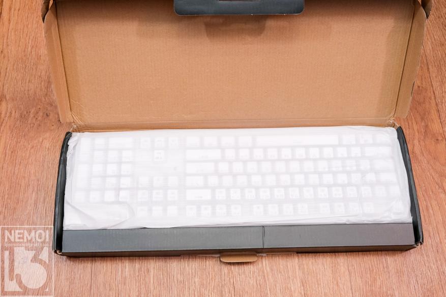 Поставляется клавиатура в симпатичной черной коробке, правда во время доставки, коробке изрядно досталось от службы доставки. Но сама клавиатура не пострадала.