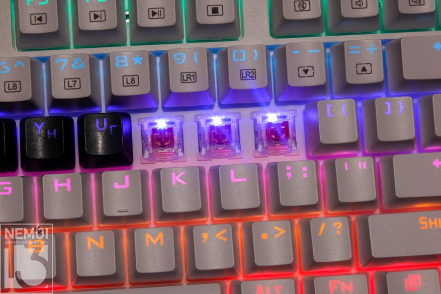 Зато тактильно, набирать текст на механике намного приятнее, чем на мембранной клавиатуре.Красные переключатели — очень плохой выбор для набора текста. У них точка срабатывания никак не выделяется тактильно, ход равномерный от самого верха до дна, поэтому ощущения от нажатия такой кнопки похожи на тычок в вату.