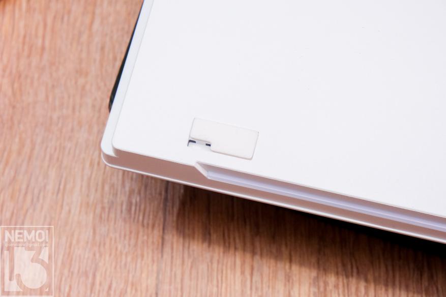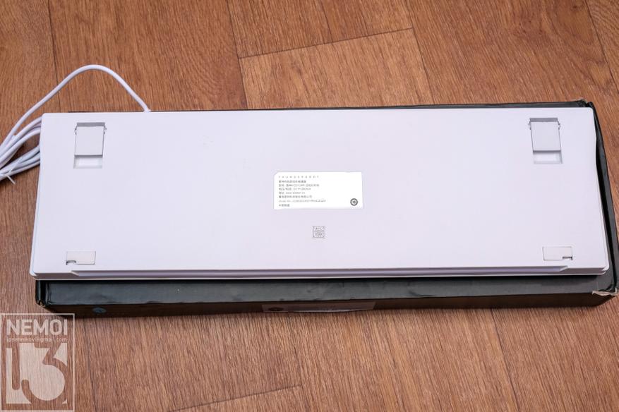 На нижней стороне клавиатуры находится шильдик с названием и моделью, а также две резиновые противоскользящие вставки и две резиновые ножки, которые в сложенном состоянии работают как ножки против скольжения, а в разложенном состоянии слегка приподнимают задний край клавиатуры (как это сделано в большинстве стандартных клавиатур)