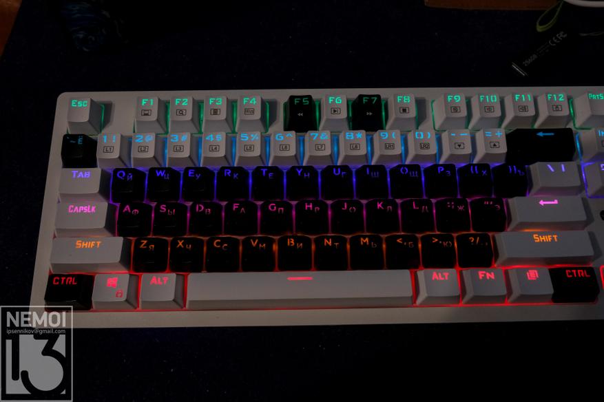 У меня в наличии кейкапы с русским шрифтом, но в чёрном цвете. Но это не проблема, потому что, поменяв блок с буквенной раскладкой, и частично другие клавиши, я получил клавиатуру в расцветке «Панда», и сейчас она выглядит вот так:
