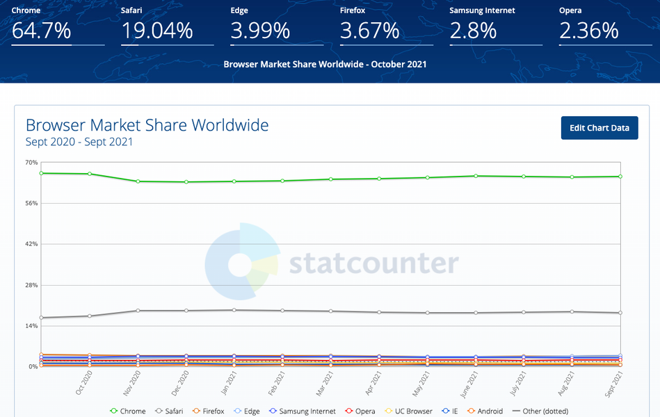 Браузер Google Chrome продолжает привычно уже доминировать в международном масштабе, занимая первое место с долей рынка 64,7%, второе и третье места занимают Safari от Apple с 19,04% и Microsoft Edge с 3,99%. На четвёртом месте с небольшим отрывом расположился Firefox с 3,67%. Пятое место занимает мобильный браузер Samsung Internet с долей 2.8%, который мы можем увидеть на смартфонах и планшетах Samsung. А браузеру Opera досталась доля в 2,36%.