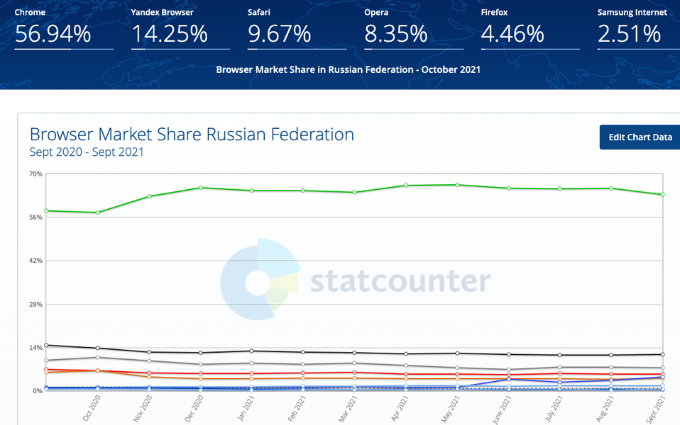Что касается России, то здесь картина несколько иная. На первом месте, конечно, находится Chrome, но с заметно меньшей долей, а второе место уверенно занимает Яндекс.Браузер. Топ-6 браузеров StatCounter для России выглядит так: