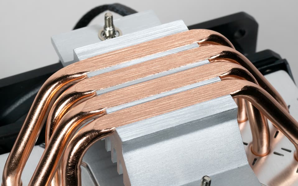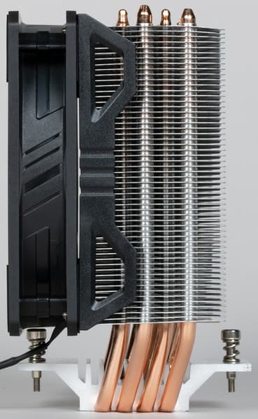 Кулер оснащен вынесенным радиатором, к которому тепло от процессора передается по четырем тепловым трубкам. Трубки, разумеется, медные. У основания теплосъемника трубки сплющены и впрессованы в канавки. Теплосъемник изготовлен из алюминия. Ребра сверху на теплосъемнике в какой-то степени улучшают производительность кулера.