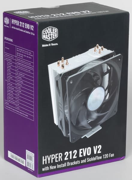 Поставляется процессорный охладитель Cooler Master Hyper 212 Evo V2 в красочно оформленной коробке из среднего по толщине гофрированного картона.