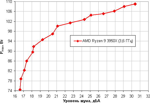 Приняв 25 дБА за критерий условной бесшумности, получим, что максимальная мощность процессора, соответствующая этому уровню, составляет порядка 104 Вт. Если не обращать внимания на уровень шума, то предел мощности можно увеличить где-то до 109 Вт. Еще раз уточним: это в жестких условиях обдува радиатора нагретым до 44 градусов воздухом. При снижении температуры воздуха указанные пределы мощности для бесшумной работы и максимальной мощности возрастают. Поэтому при условии достаточно хорошей вентиляции в корпусе данный кулер как-то справится с охлаждением процессора AMD Ryzen 9 3950X, но на возможность существенного разгона рассчитывать уже не стоит.