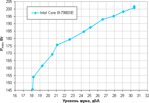 Приняв 25 дБА за критерий условной бесшумности, получим примерную максимальную мощность процессоров, соответствующих этому уровню. Это порядка 185 Вт для процессора Intel Core i9-7980XE. Если не обращать внимания на уровень шума, то пределы мощности можно увеличить где-то до 200 Вт. Еще раз уточним, это в жестких условиях обдува радиатора нагретым до 44 градусов воздухом, при снижении температуры воздуха указанные пределы мощности для бесшумной работы и максимальной мощности возрастают.
