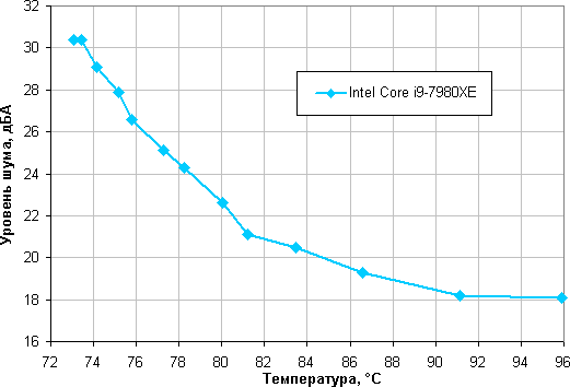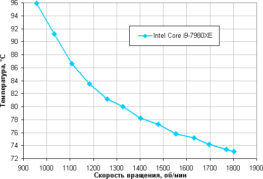 При КЗ = 40% (примерно 960 об/мин) кулер уже не справляется с охлаждением процессора Intel Core i9-7980XE.