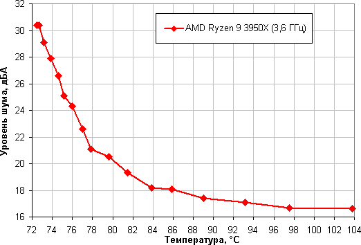 Зависимость уровня шума от температуры процессора при полной загрузке: