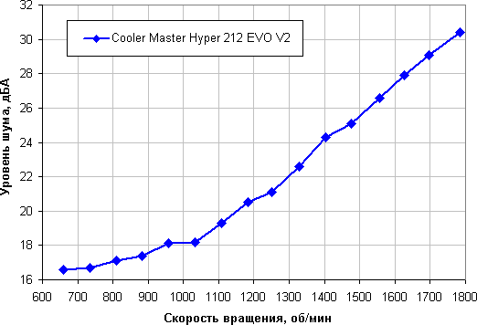 Зависит, конечно, от индивидуальных особенностей и других факторов, но в случае кулеров где-то от 40 дБА и выше шум с нашей точки зрения очень высокий для настольной системы, от 35 до 40 дБА уровень шума относится к разряду терпимых, ниже 35 дБА шум от системы охлаждения не будет сильно выделяться на фоне типичных небесшумных компонентов ПК — вентиляторов корпусных, на блоке питания, на видеокарте, а также жестких дисков, а где-то ниже 25 дБА кулер можно назвать условно бесшумным. Фоновый уровень был равен 16,3 дБА (условное значение, которое показывает шумомер). Кулер Cooler Master Hyper 212 Evo V2 можно считать относительно тихим устройством.