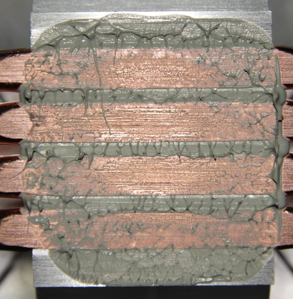Видно, что термопаста распределилась тонким почти по всей плоскости крышки процессора, а ее избыток выдавился по краям. В местах соприкосновения трубок с крышкой процессора есть области плотного контакта. Отметим, что крышка данного процессора не идеально плоская, а слегка выпуклая.