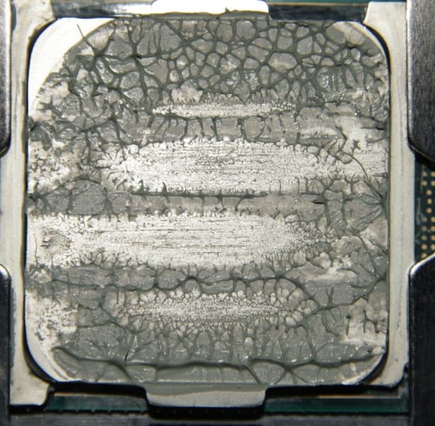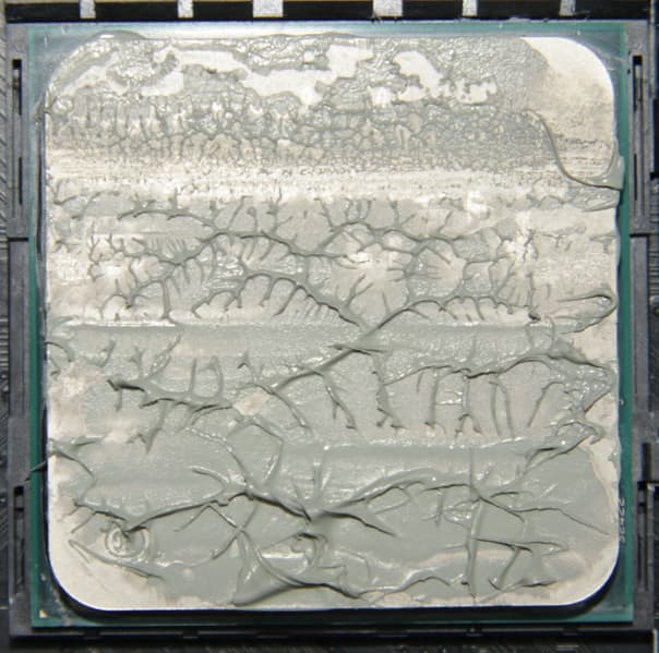 Преднанесенного термоинтерфейса нет, но производитель приложил к кулеру небольшой шприц с термопастой MasterGel Pro. Комплектного запаса термопасты должно хватить раза на два в случае процессоров с небольшой площадью крышки и при экономном расходе. В тестах использовалась не менее качественная термопаста другого производителя. Забегая вперед, продемонстрируем распределение термопасты после завершения всех тестов. На процессоре Intel Core i9-7980XE: