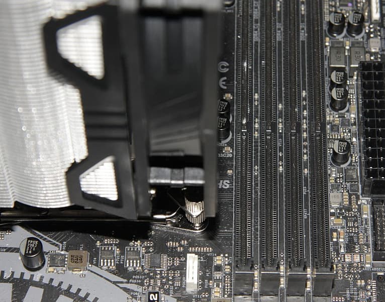 Радиатор смещен в сторону от вентилятора, что гарантирует совместимость с высокими модулями оперативной памяти. На фотографии ниже это видно: