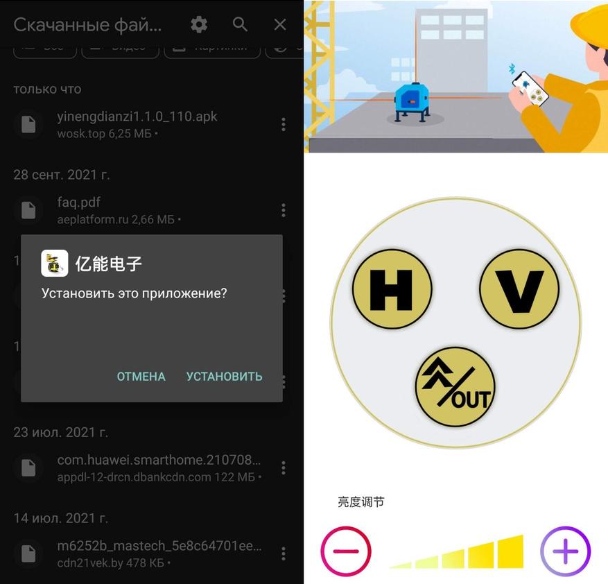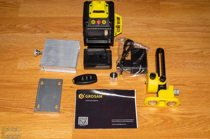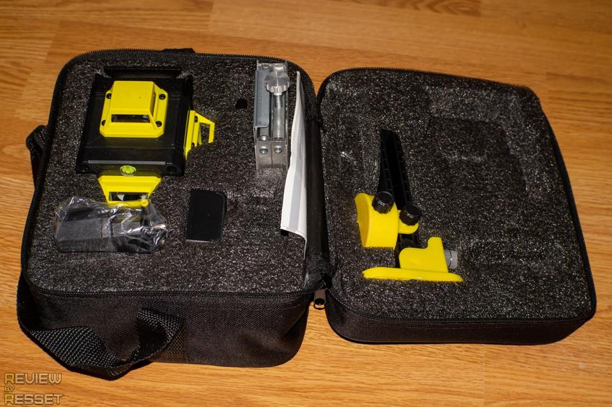 В нее помещается нивелир, магнитный подвес с металлической пластиной для крепления на древесине/пластике, микролифт, пульт ДУ, переходник 1/4"-5/8", аккумулятор, зарядное устройство и инструкция на русском языке