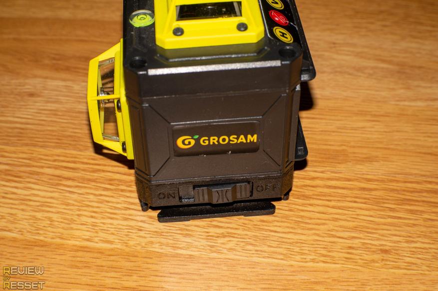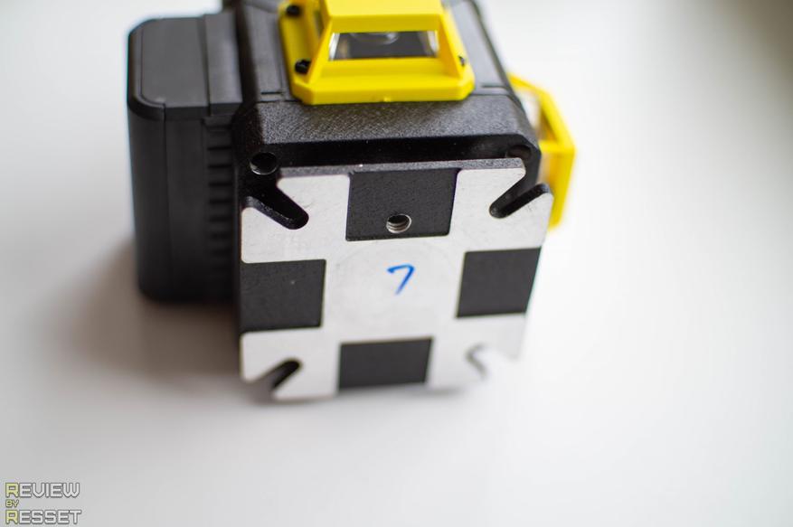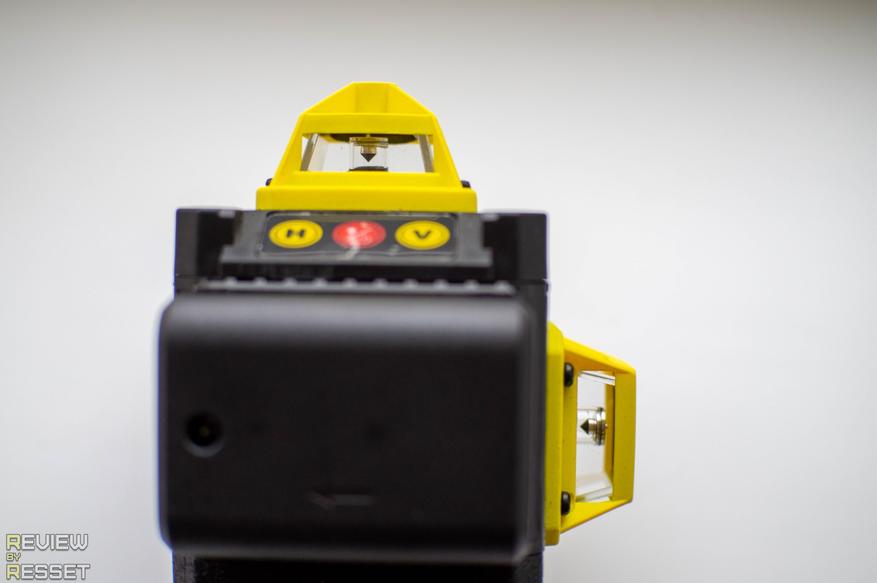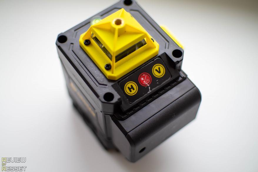 Аккумулятор фиксируется на лицевой стороне, над ним расположены сенсорные кнопки для включения горизонтальных, вертикальных линий и управления их яркостью. В верхней и нижней частях находится резьба для крепления к подвесу или штативу, на правом фото можно рассмотреть конусообразные отражатели, на которые падает луч лазера и преломляется под 90° по кругу