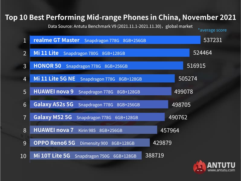 Статистика собрана в период с 1 по 30 ноября 2021 года. В рейтинге AnTuTu используются средние, а не самые высокие результаты. Для каждого смартфона учитывались результаты не менее 1000 тестов — модели с меньшим количеством тестов в рейтинг не попадают.