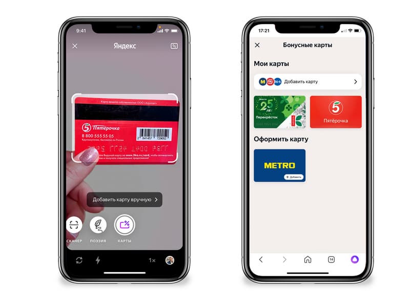 В приложение можно добавить любую карту, у которой есть штрих-код или QR-код. Достаточно отсканировать их умной камерой из приложения — в ней появился режим для добавления карт. В новом разделе можно также оформить карту Metro или «Перекрёстка».