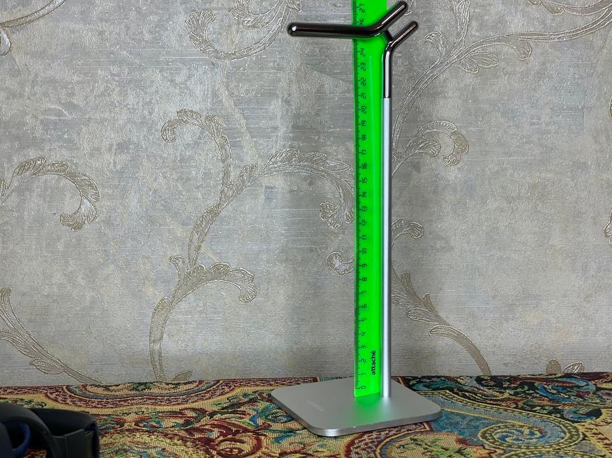 Данное устройство имеет оптимальную высоту и ширину базы, чтобы повисшие наушники не касались стола, а вся конструкция оставалась устойчивой.