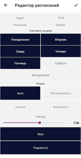 А с помощью редактора расписаний можно запрограммировать увлажнитель на включение и работу в соответствии с заданными параметрами. Таких расписаний можно создать сколько угодно, хоть на каждый день года.