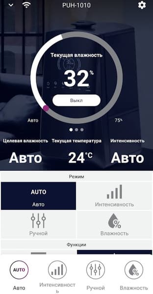 Наконец-то мы можем увидеть температуру в помещении (на дисплее увлажнителя она не демонстрируется). Помимо нее, на главной странице мы видим текущий уровень влажности и актуальный режим. По умолчанию это Авто: и целевую влажность, и интенсивность подачи пара прибор выбирает сам. Кнопка в центре круга включает и выключает увлажнитель.