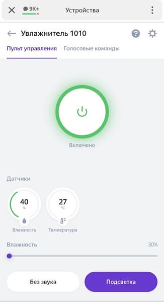 Перед нами электронный пульт, с которого можно включить или выключить прибор, установить целевую влажность, отключить звук или подсветку или просто ознакомиться с текущими влажностью и температурой.