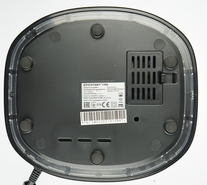 Polaris не предписывает совершать какие-либо специальные действия перед первым включением PUH 1010. Мы осмотрели полость для воды, убедились, что она девственно чиста, и залили воду в резервуар (рекомендуется использовать дистиллированную, но мы понадеялись на мягкость питерской водопроводной). После установки резервуара на базу немного подождали, чтобы вода поступила в полость основания — об этом сигнализирует характерное бульканье.