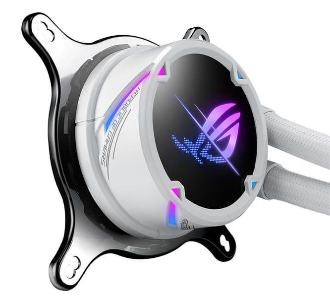 В белый цвет окрашены радиаторы, 120-миллиметровые вентиляторы, нейлоновая оплетка шлангов, а также большая часть блока помпы. Логотип ROG с ARGB-подсветкой на блоке контрастно выделен черным. С точки зрения характеристик новые системы охлаждения не отличаются от базовых моделей. Но есть заметное конструктивное новшество — встроенная поддержка разъема LGA1700.