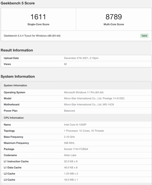 В бенчмарке Geekbench засветился новый ноутбук MSI Prestige 14 (A12SC). Устройство построено на пока не представленном процессоре Core i5-1250P семейства Alder Lake. Официальная премьера мобильных CPU Alder Lake ожидается в начале января, но Geekbench уже раскрыл характеристики этого процессора.