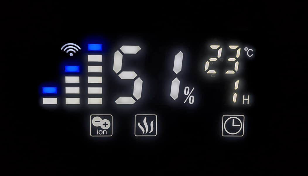 Столбики слева от показаний гигрометра указывают на текущую мощность увлажнителя — синим цветом выделяется первая, вторая или третья «скорости». Индикатор Wi-Fi над ними мигает при поиске сети и горит постоянно при работающем подключении.
