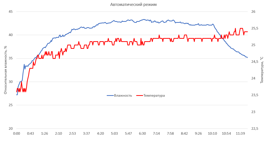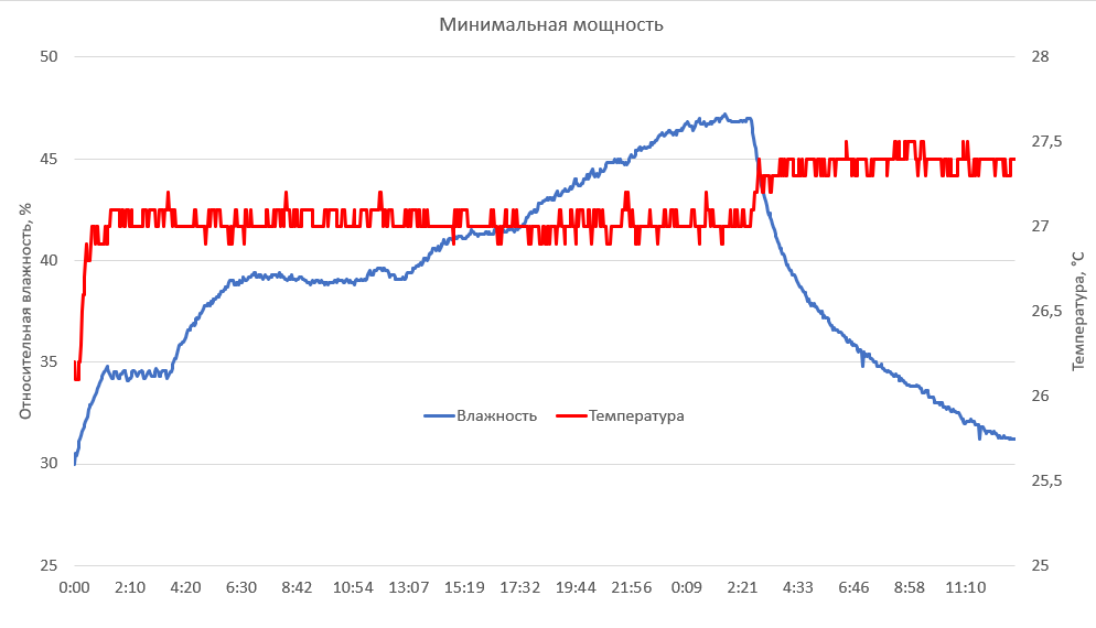 На этот раз прибор проработал до отключения почти 13 часов. Относительная влажность в комнате увеличивалась с 30% до 57% и, в отличие от предыдущего теста, имела тенденцию к дальнейшему повышению.
