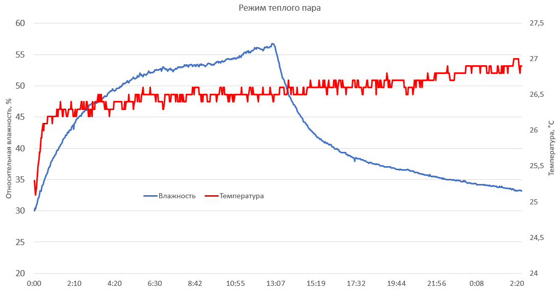 В следующем тесте нас интересовало, как долго может проработать прибор в режиме теплого пара и насколько он способен увеличить влажность в таких условиях.