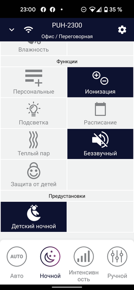Чуть ниже можно выбрать подходящий режим работы (автоматический, ночной, детский, ручной) или настроить свой собственный, выбрав интенсивность увлажнения, целевую влажность, громкость звуковой сигнализации и дополнительные функции: ионизацию, теплый пар, беззвучность, подсветку дисплея и бака, а также время автоотключения прибора.
